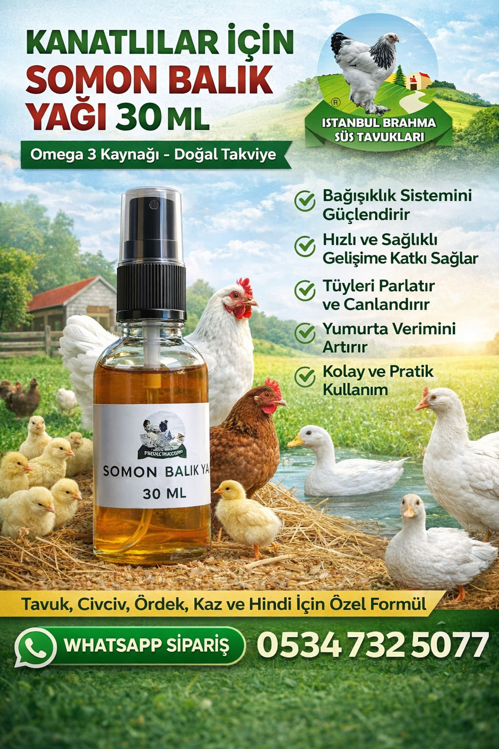 Kanatlılar ve Civcivler İçin Somon Balık Yağı 30 ML, tavuk, civciv, ördek, kaz ve hindi gibi tüm kanatlı hayvanlarda